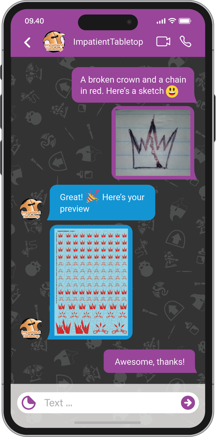 See in storeName any 12 designs. Sheet will contain ten copies of each. Sizes will be suitable for common 28/32mm space marine miniatures.